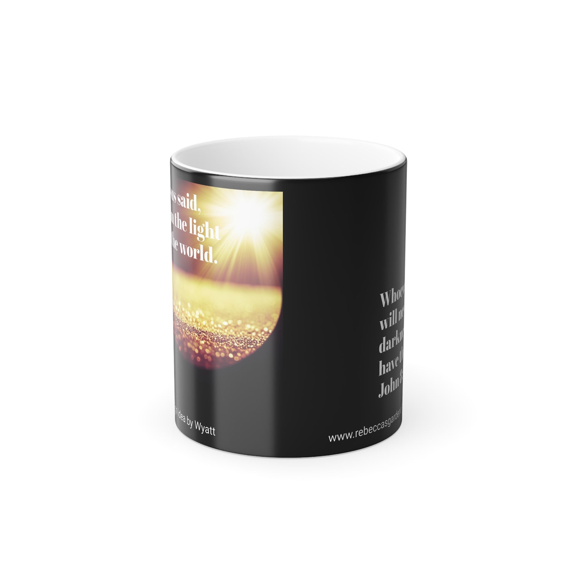 This 11 oz mug changes color from solid black to reveal the beautiful message from John 8:12: Jesus said, I am the light of the world. Whoever follows me will never walk in darkness, but will have the light of life. Design idea by Alexys, a Rebecca's Garden of Hope Participant. The heat-reactive surface reveals your custom designs once the mug gets warm. The ceramic cup will go back to its original black outside and white inside when it cools down. The C-shaped handle helps keep a sturdy grip. It comes in one size – 11oz (0.33l) – plenty for that big morning cup of coffee.