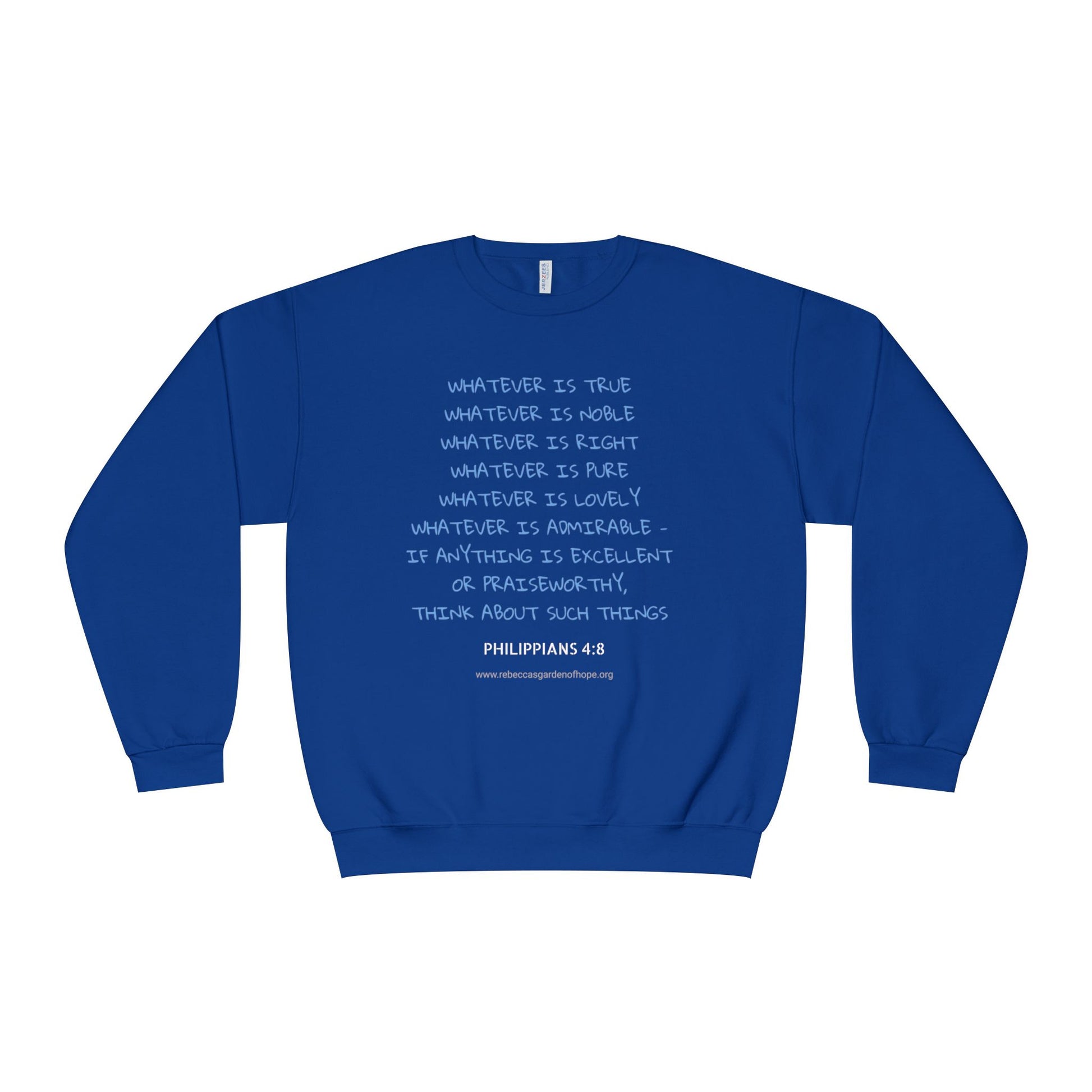 Crewneck Sweatshirt - Philippians 4:8 Bible Verse design inspired by a Rebecca's Garden of Hope Participant for chilly summer evenings and warm winter layers, sweatshirts are a staple item all year round. The NuBlend® fleece is pre-shrunk, pull-resistant, and quarter-turned so it won't crease in the middle. Made from 50% polyester and 50% sustainably sourced USA cotton, they're very soft to the touch. All proceeds go to benefit Rebecca's Garden of Hope programs. Visit www.rebeccasgardenofhope.org for additional information.