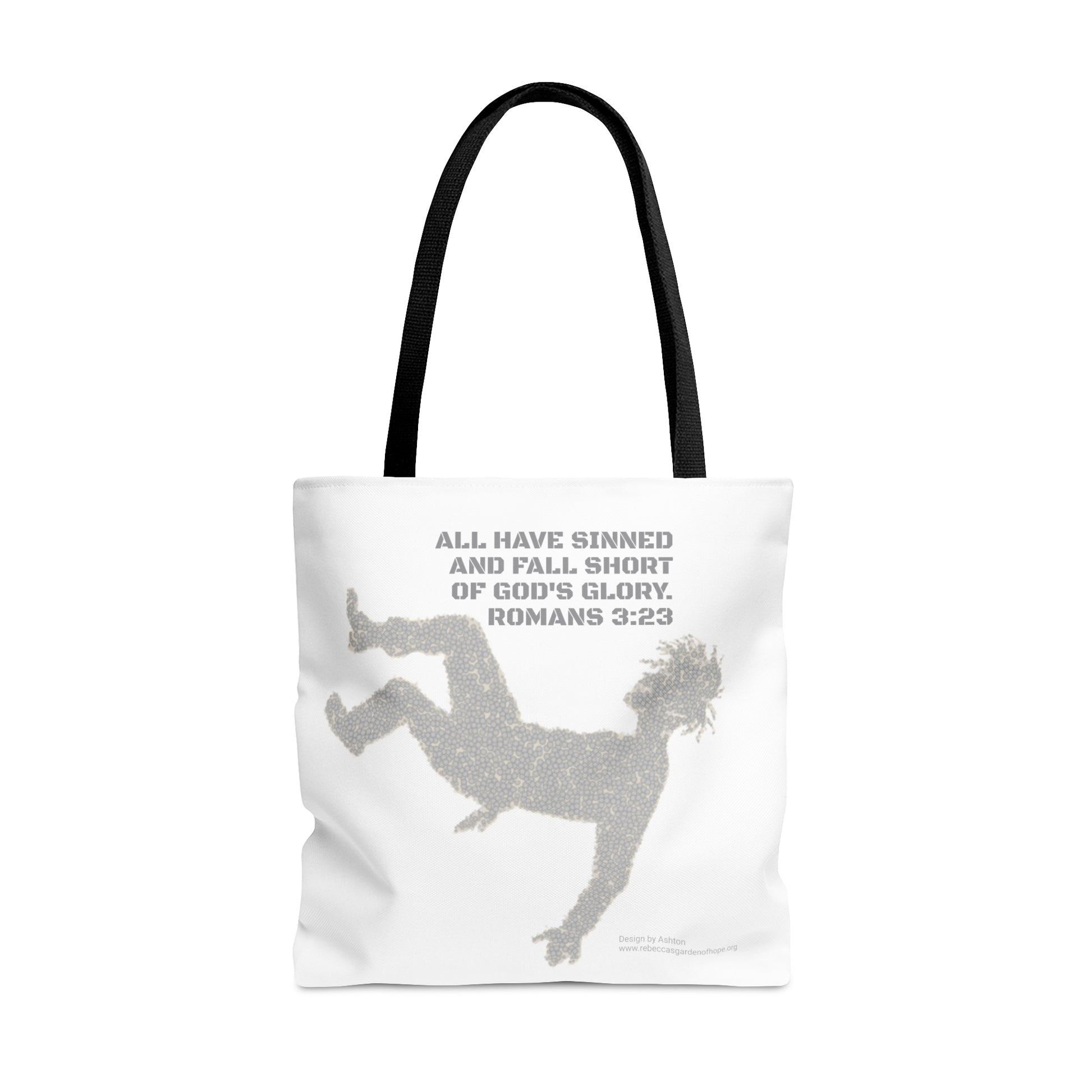Designed by a Rebecca's Garden of Hope participant, Ashton, this practical, high-quality tote bag features the Bible Verse Genesis 3:23 ALL HAVE SINNED AND FALL SHORT OF GOD'S GLORY. Printed on both sides, all-over print provides comfort with style. Made in the USA from reliable materials that will last for seasons. Proceeds from the sale of this item benefit Rebecca's Garden of Hope. Visit our website at www.rebeccasgardenofhope.org for more information.
