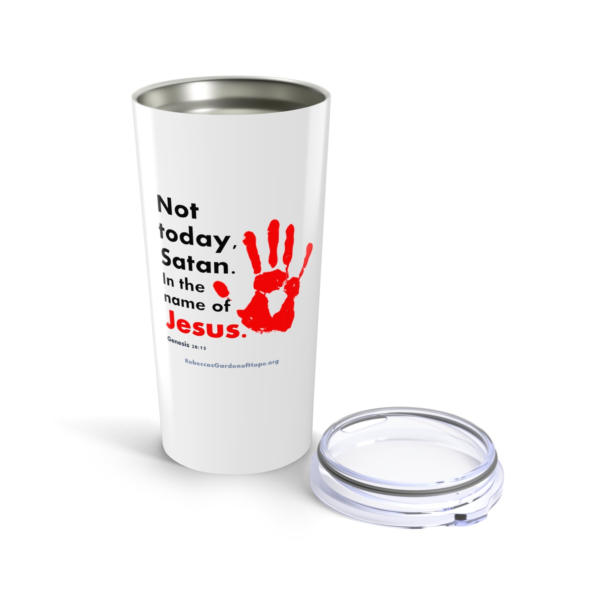 Tumbler 20oz Not Today Satan design by Enchelle, a Rebecca's Garden of Hope participant. This stainless travel-size tumbler is vacuum-insulated and built to last. It's perfect for showing off your style on the road, at the office, or in the countryside. All proceeds benefit the Rebecca's Garden of Hope tutoring, mentoring, and discipleship programs. Visit www.rebeccasgardenofhope.org for additional information.